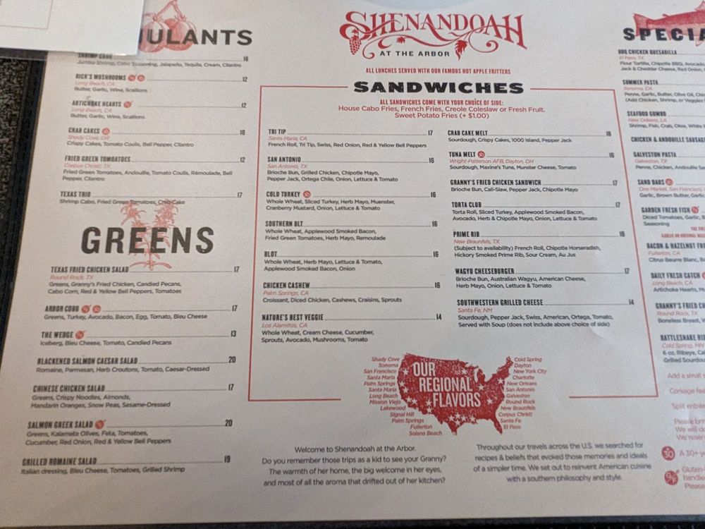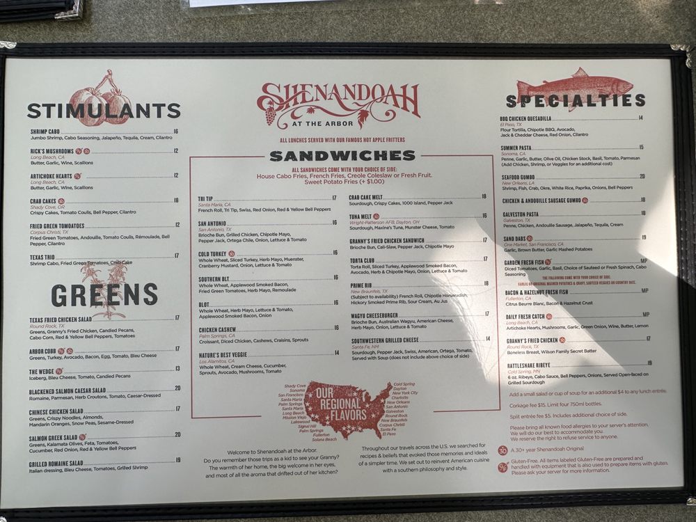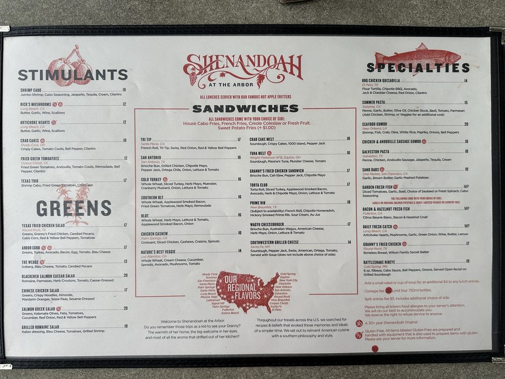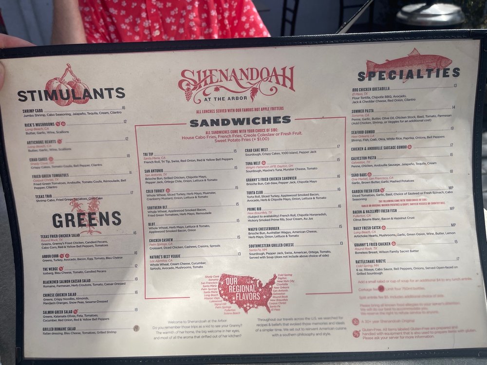Introducing the menu at Shenandoah At the Arbors, a charming restaurant in Los Alamitos, CA, that offers a variety of delightful dishes. From starters like Shrimp Cabo and Rick's Mushrooms, to salads like Texas Fried Chicken Salad and Blackened Salmon Caesar Salad, there's something for everyone. Their Dinner From the Coop section features mouthwatering options like Lemon Chicken and Raspberry Chipotle Duck. Customers rave about the friendly service and lovely outdoor seating with twinkling lights. The complimentary apple fritters and rolls are a must-try. With a mix of Southern French flavors and a cozy ambiance, Shenandoah At the Arbors is a top choice for a delicious dining experience.